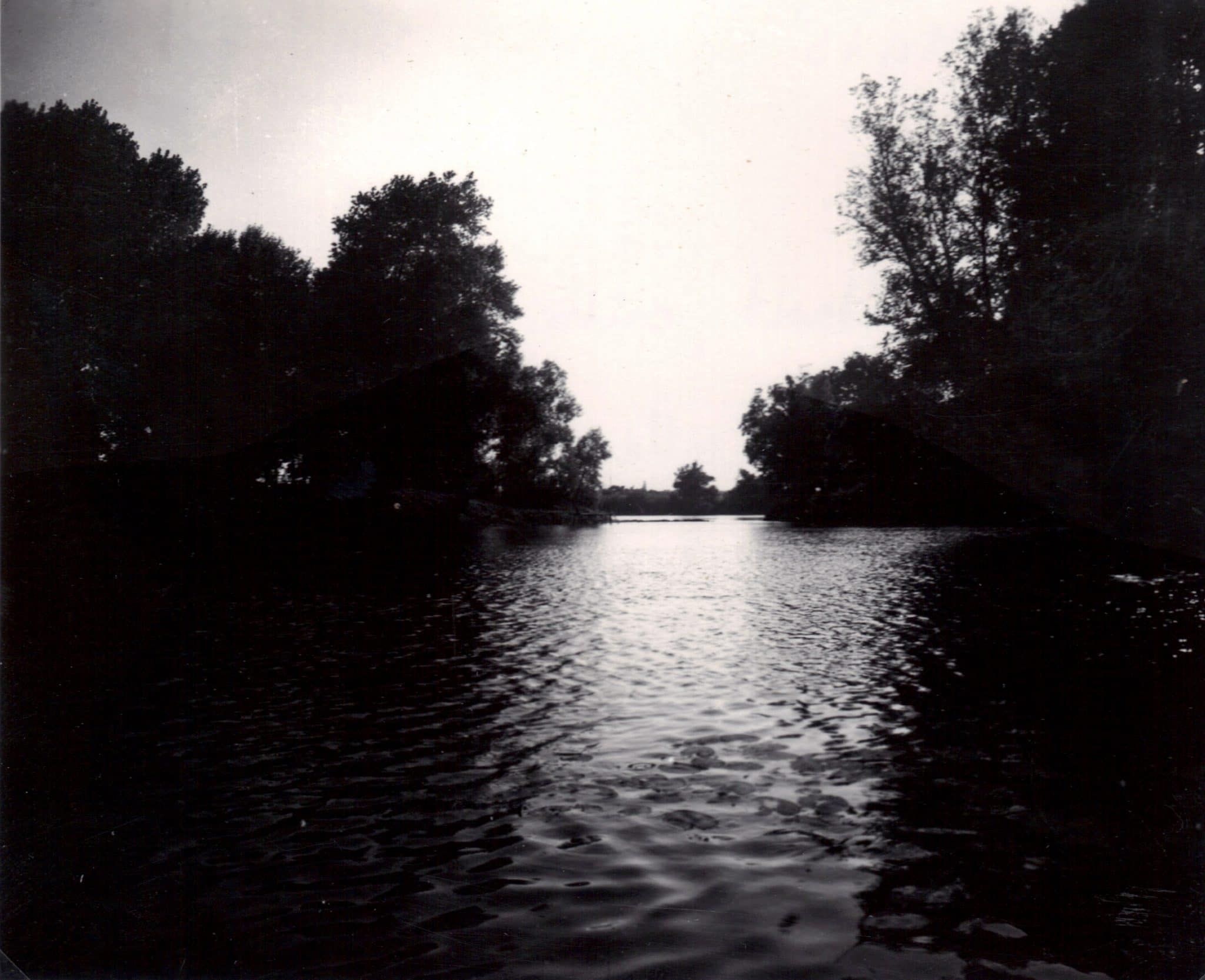 Le voisin importun m’abandonne et je continue à descendre le courant jusqu’au lac du bras moyen où je m’amarre à une fiche et pêche et je pêche, sans résultats, près du grand arbre branchu couché dans l’eau.