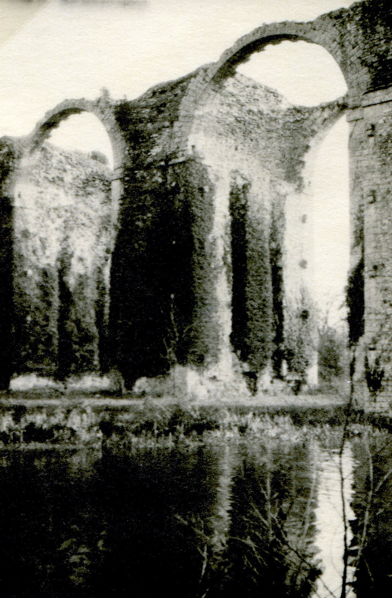 Mais, dans le coin où nous sommes, c’est propre de débris guerriers et la nature semble paisible et pacifique : à droite, un pont de bois est jeté sur un bras de l’Eure, en face, les futaies dépouillés par l’hiver nous offrent des sons très doux, à gauche, seulement, dans l’encadrement d’une arche de l’Aqueduc, on aperçoit le Château de Maintenon dont une tour en réparation (reste du bombardement) lui donne un vague aspect de pagode chinoise.
