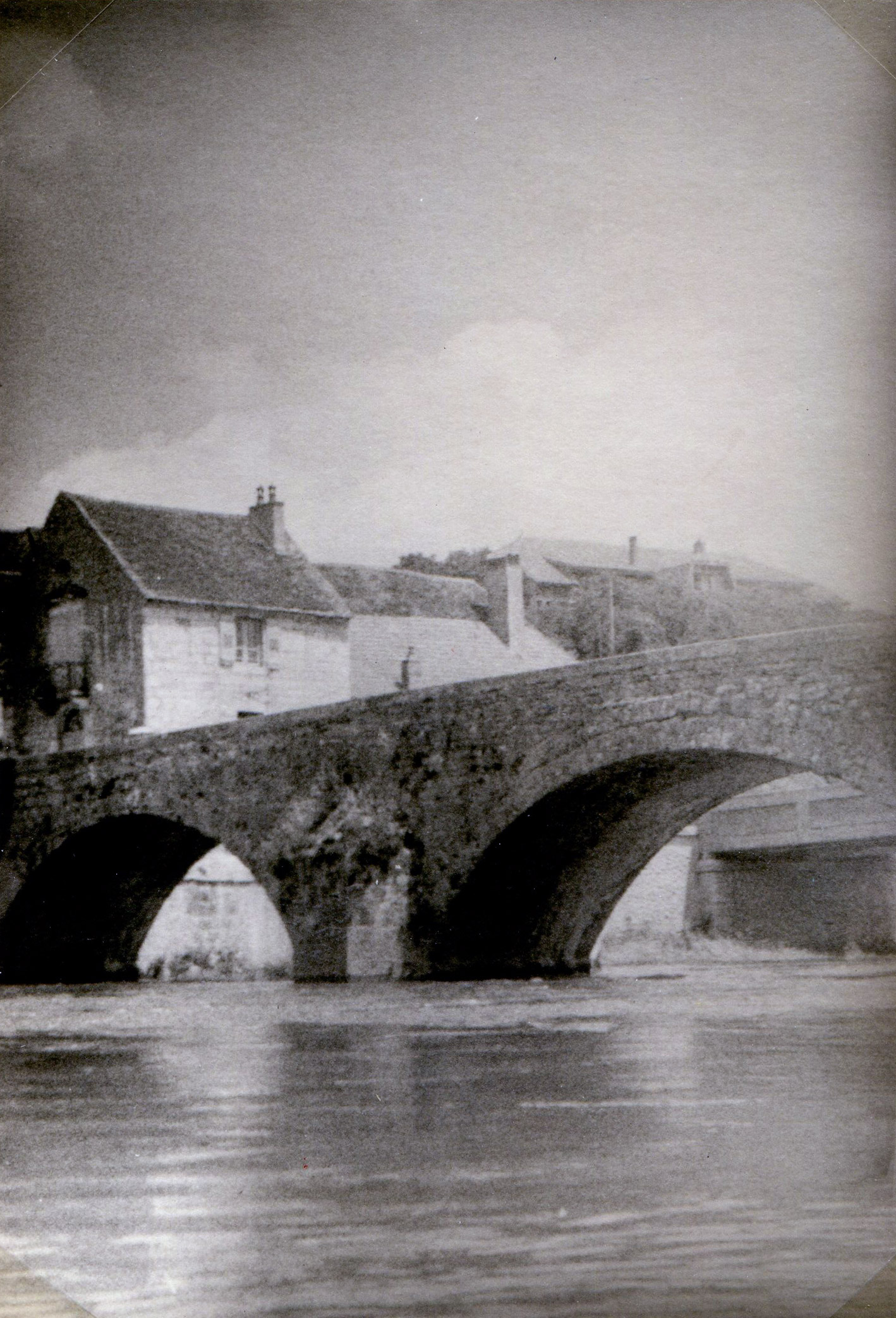 As we lack water, we make a short stopover after the bridge of X..., baptized by us "Pont Pisseux", because of the dripping that flows from one of its arches. On the left bank, in the village of ... I go to fetch water after a short shower which does not give us much shelter as we are under our raincoats on the one hand and on the other hand under a huge abalone which covers us and our Kingfisher.