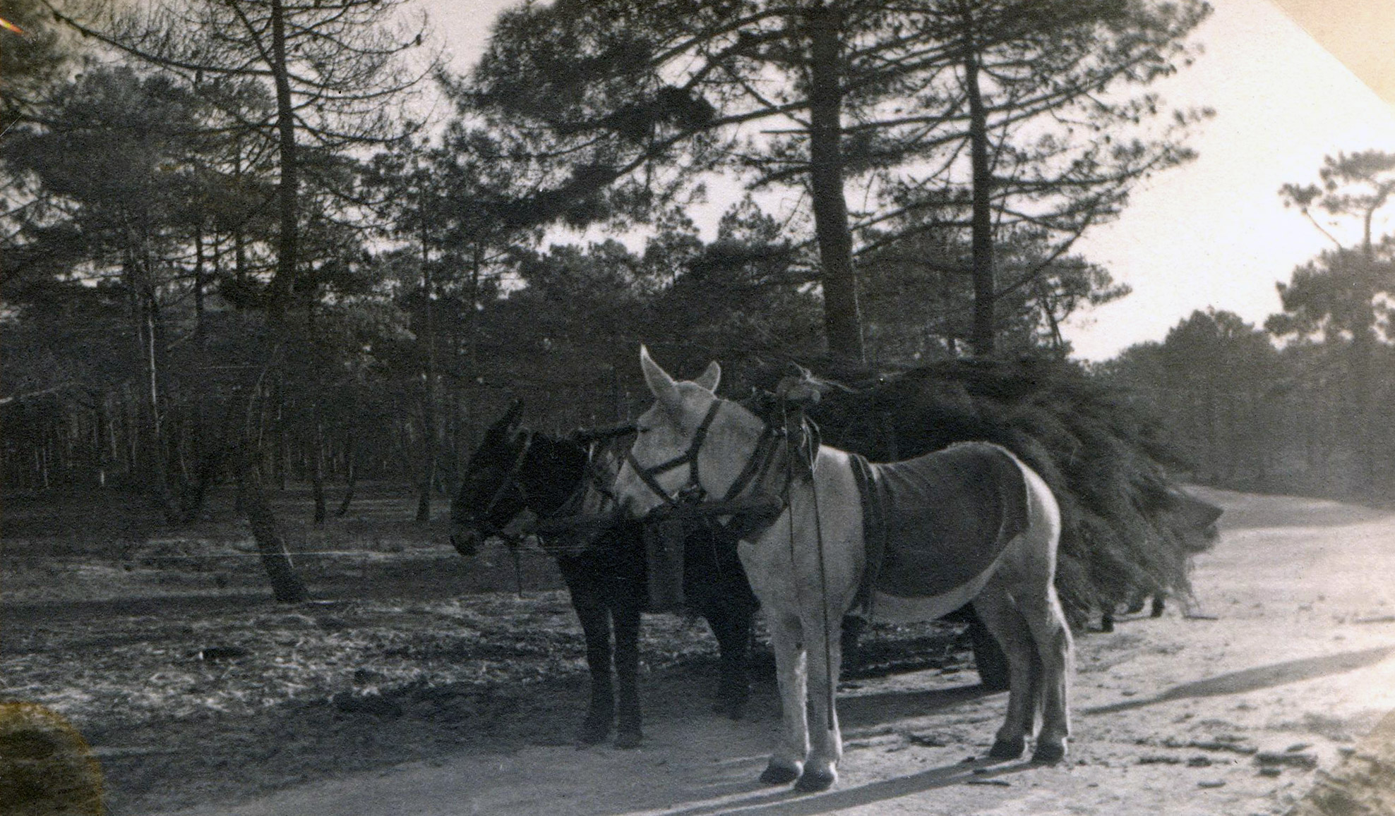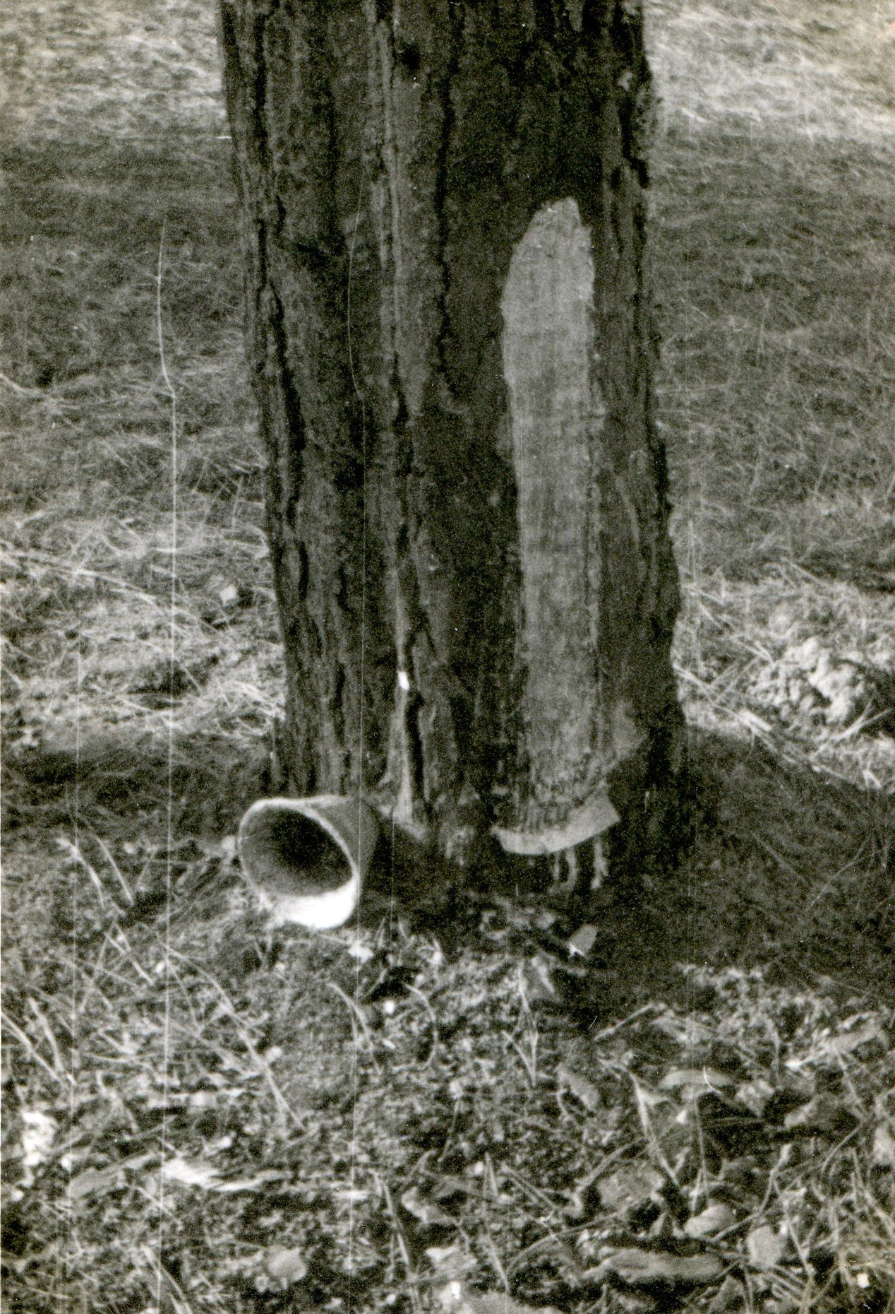 Je rencontre les premiers pins creusés des rigoles des résiniers et aux pieds desquels les gobelets de terre cuite, de forme si gracieuse sont déposés, la résine ne coulant pas à cette époque.