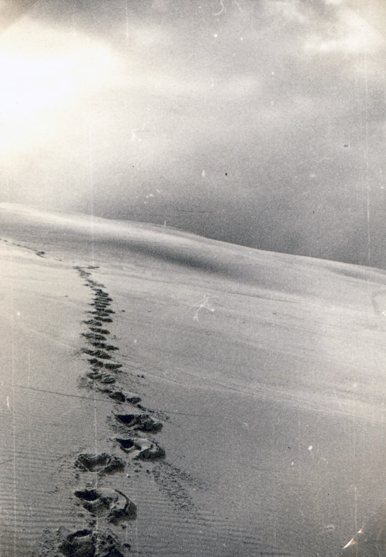De temps à autre, sur ma gauche, le rivage se révèle par son cordon de dunes dont le sable blanc est si ressemblant à la neige. Ces dunes sont énigmatiques et leur manque de végétation fait commettre des erreurs d’appréciation dans les distances vraiment peu ordinaires. Même en les escaladant, tout près de leurs sommets, j’ai du mal à estimer leurs mesures, car elles semblent sorties d’un monde qui n’aurait pas nos dimensions, et le soleil d’hiver, si bas, fausse encore les choses avec sa lumière rasante.