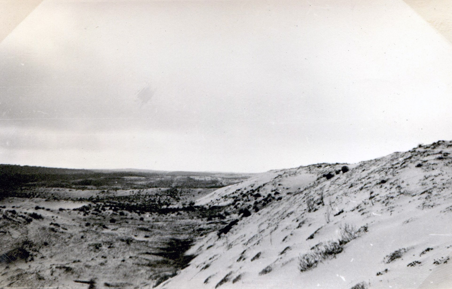 J’attaque la dune elle-même. C’est une rude pente de sable qui, bien que mouillé, s’éboule sérieusement. A chaque pas je m’élève de 40cm pour retomber de 30. Presque jusqu’au sommet et la pente reste unis comme un billard, mais un billard penché à 45°. Malgré une montée en lacets, plusieurs arrêts me sont nécessaires et j’arrive en haut « suant, soufflant, rendu ». La récompense est immédiate : vue unique. A l’ouest, la mer, parsemée de bancs de sable du Toulinguet, où le cap Ferret s’allonge indécis de l’endroit où il s’arrêtera. A l’est, la forêt qui étend ses croupes, aussi illimitée que la mer. Au nord, les premières villas d’Arcachon se noient dans la brume qui me laisse pourtant assez de visibilité pour juger de l’importance du cordon de dunes : je suis sur la plus haute, mais d’autres ondulent 20 ou 30 mètres plus bas sur une longueur totale de 5 à 6 km. A l’opposé du côté ouest, sur la forêt, elles tombent brusquement ensevelissant les pins dont certains ne laissent plus voir que le sommet de leurs houppiers.