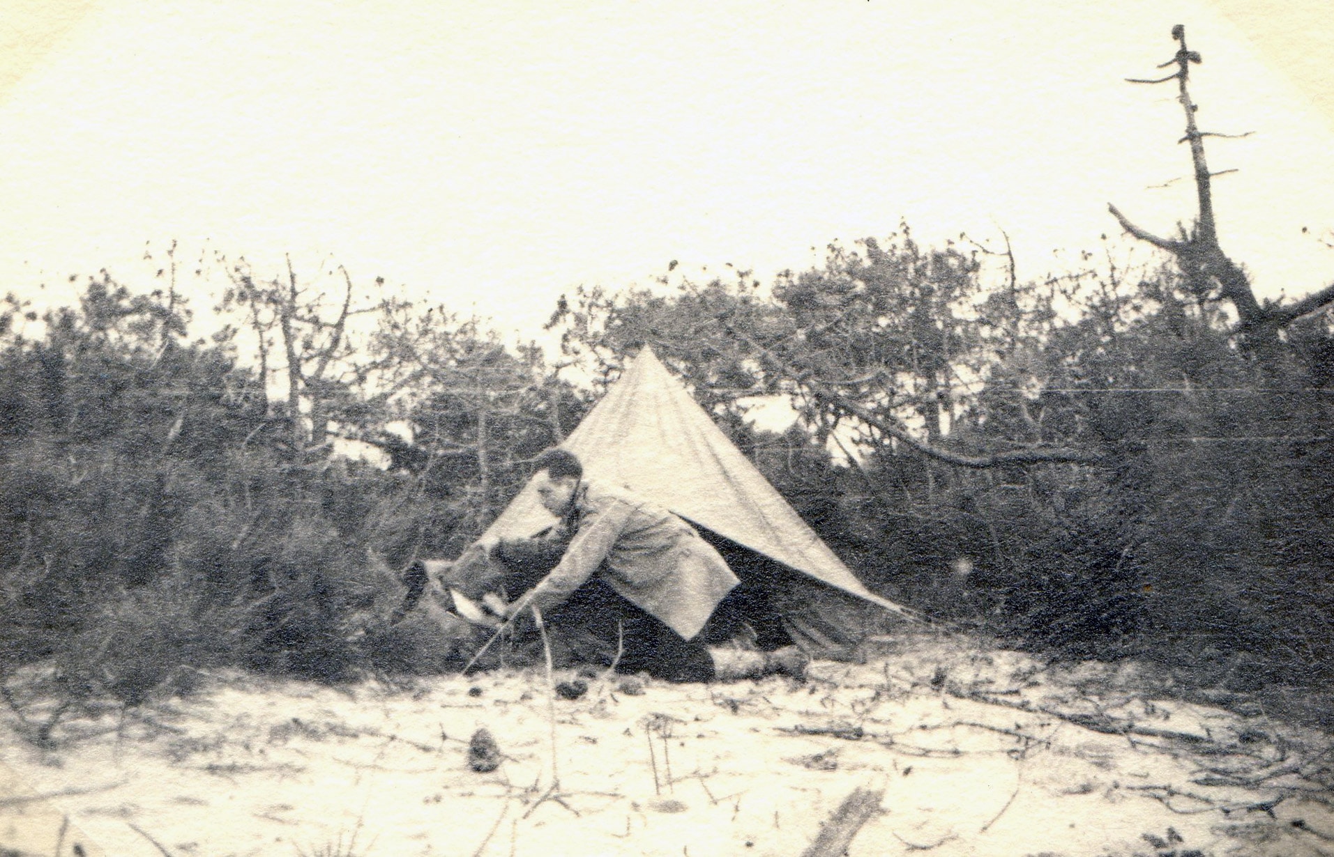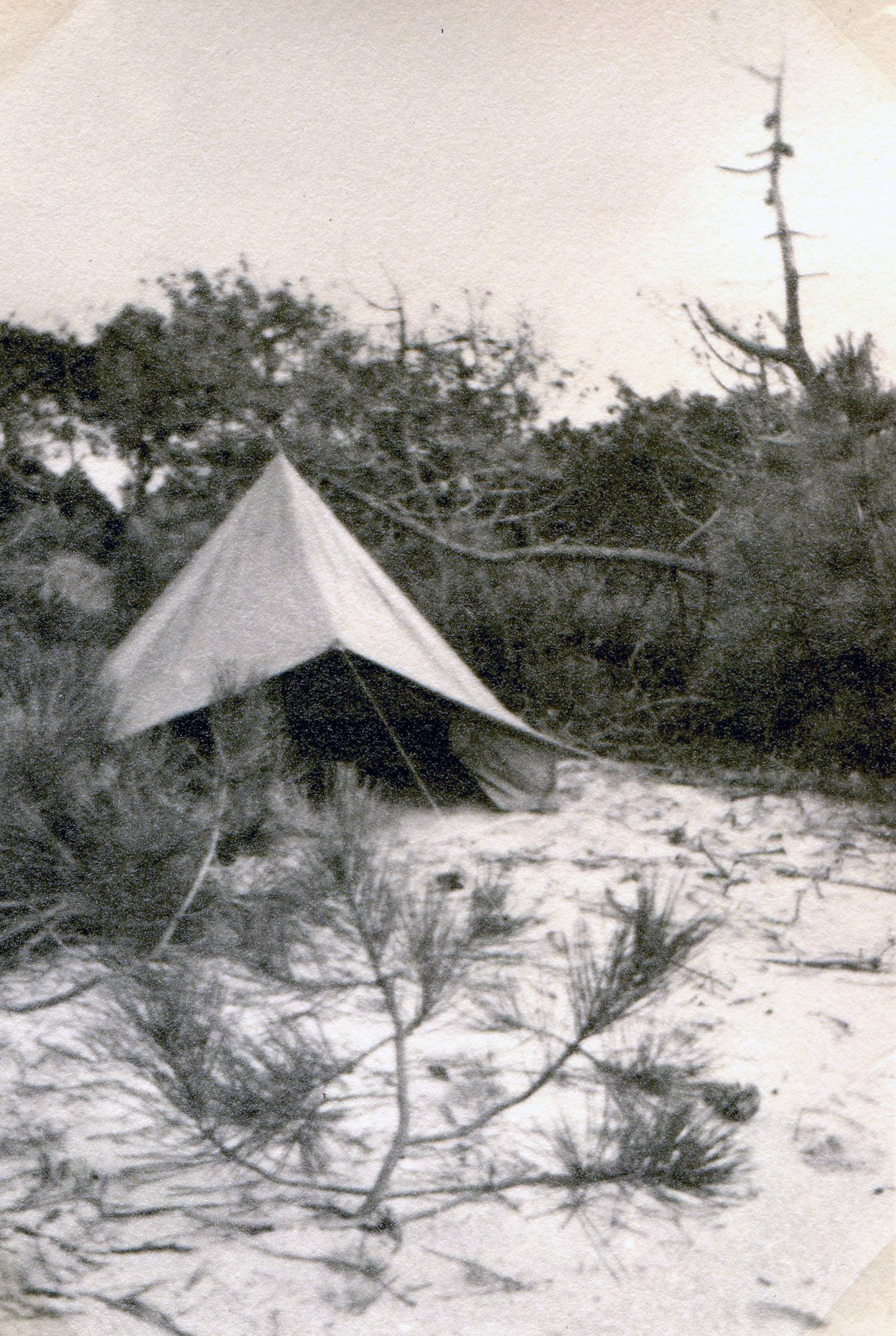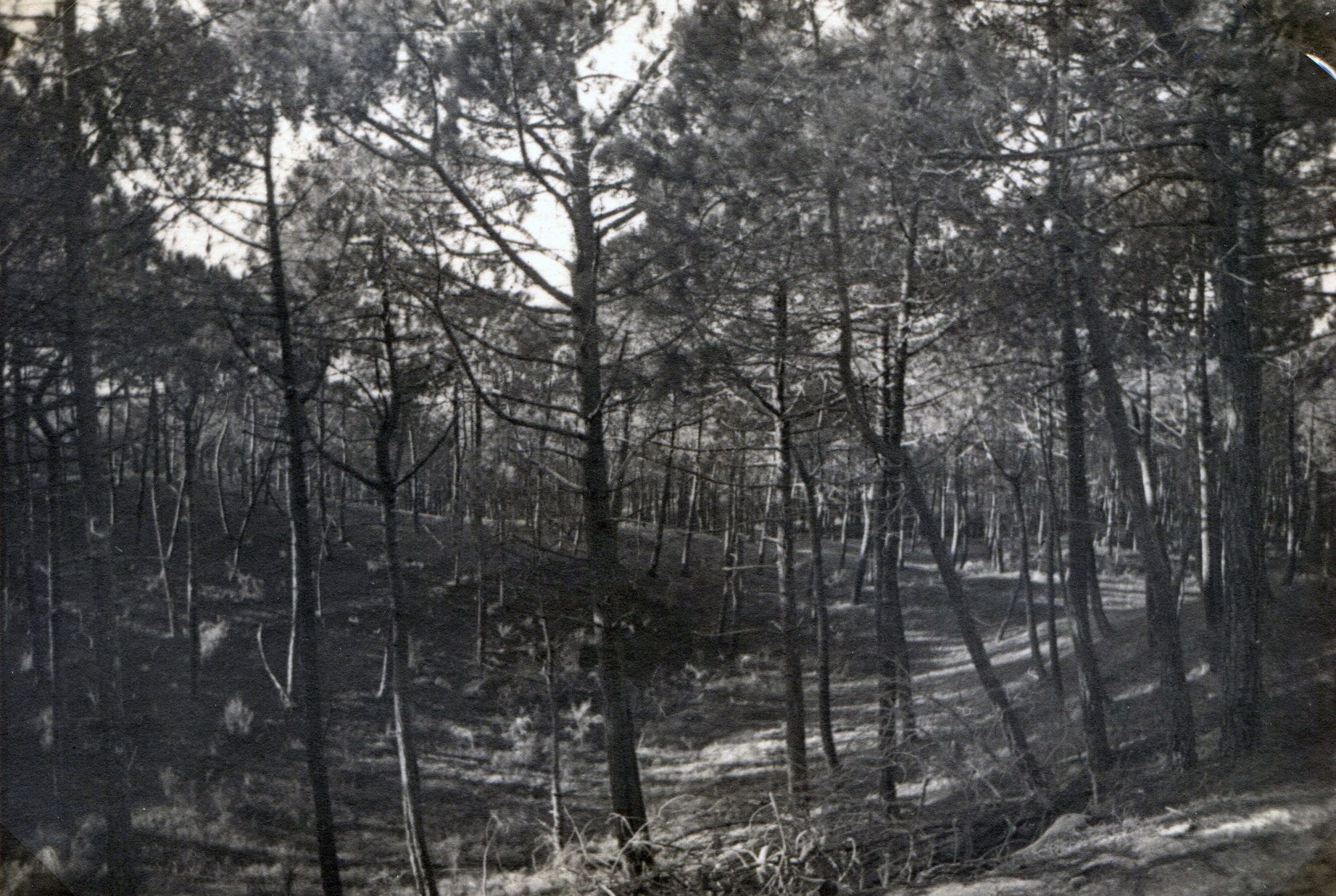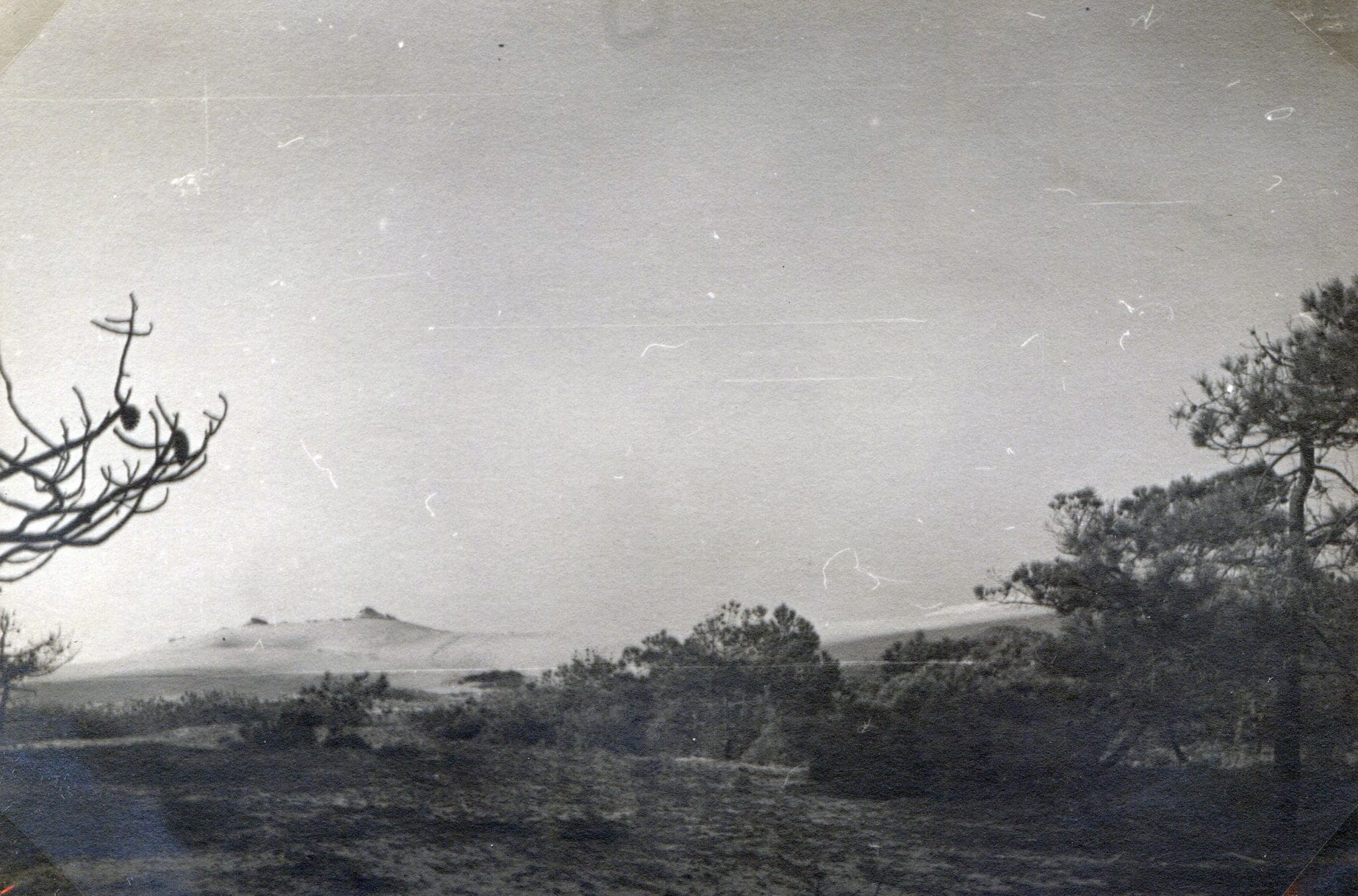 Tout le long de l’océan ce n’est qu’une infinie ligne de dunes de 20 à 60cm de haut, nues ou couvertes d’une herbe maigre et derrière lesquelles vivotent des arbrisseaux rachitiques puis des pins aux formes tourmentées poussant au milieu d’innombrables arbres morts sur pied. Ce n’est qu’à 3 ou 400 mètres derrière la protection des dunes que les arbres ont la force de pousser droit et vigoureux, de plus en plus, à mesure que l’on va vers l’intérieur.
