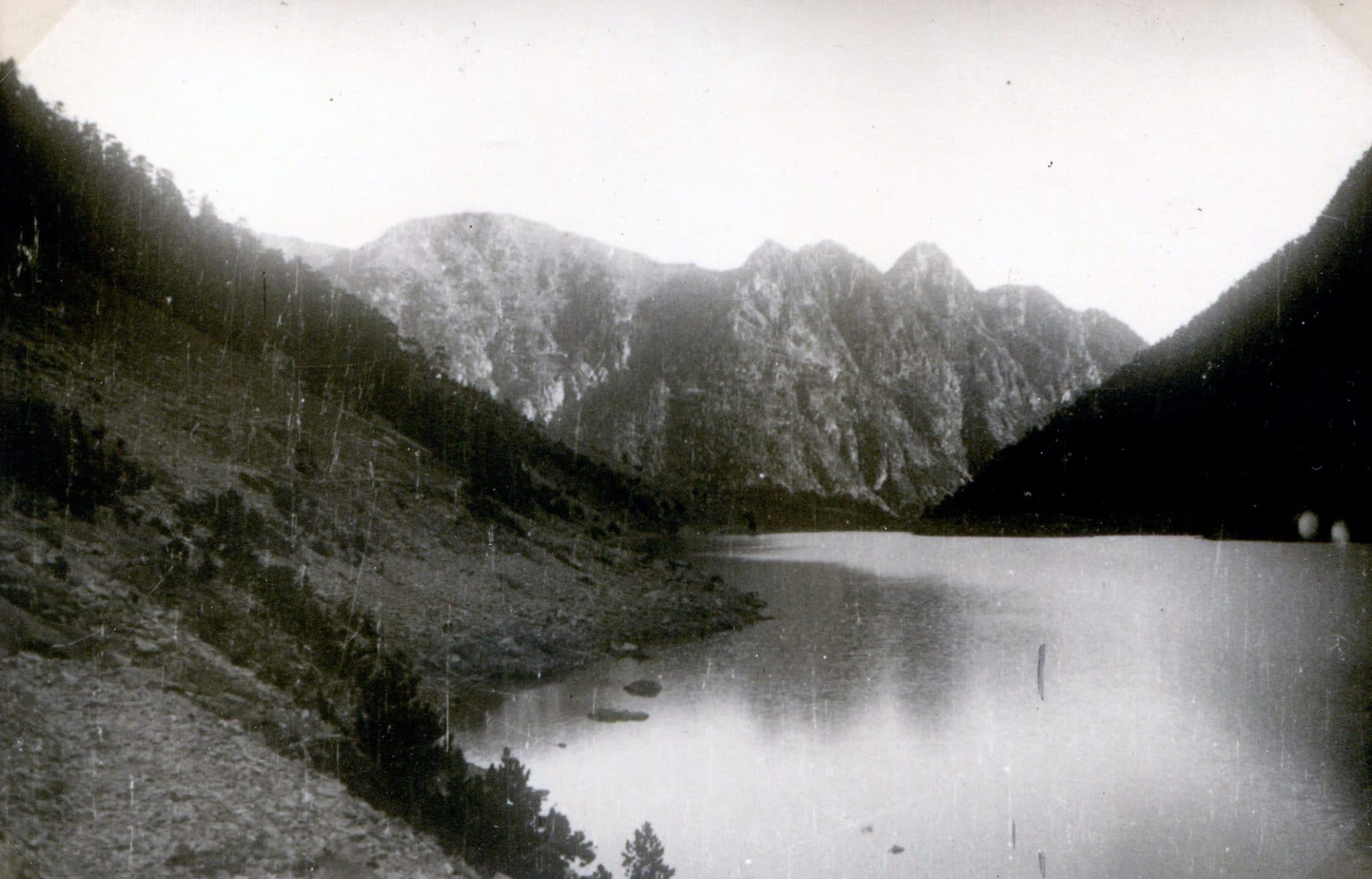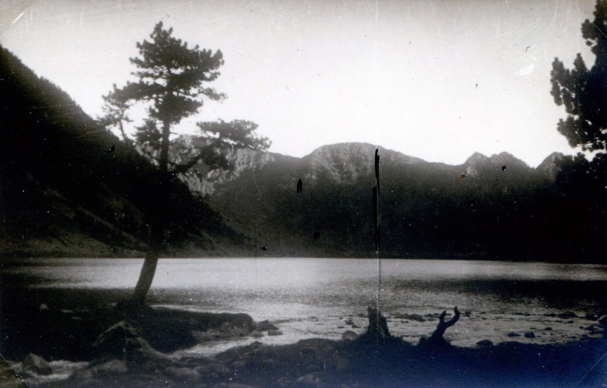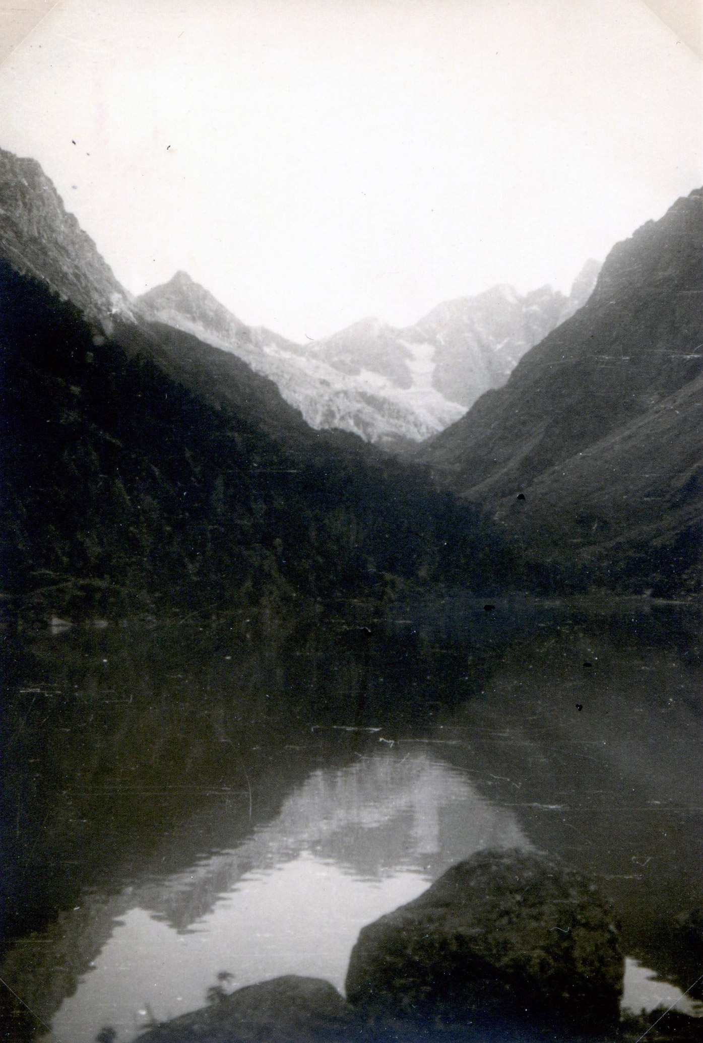 Je fais une halte au sommet de la côte et quelques victuailles sont les bienvenues. Je mange heureux de contempler de plus près ces sommets qui maintenant se montrent dénudés et fiers dans le soleil couchant. Le lac de Gaube ne dois plus être bien loin, en route ! Un kilomètre de montagnes russes sans grande fatigue m’y conduit : dans une vaste dépression je le devine, puis l’aperçois d’un bleu-vert laiteux enserré de sommet de plus de 2 000m boisés et verdoyants ou peureux et désolés suivant l’altitude. Au fond, le glacier du Vignemal parait narguer le soleil de sa neige qui ne fond jamais. Je camperai ce soir en vue des neiges éternelles : comment dépeindre mon émotion…