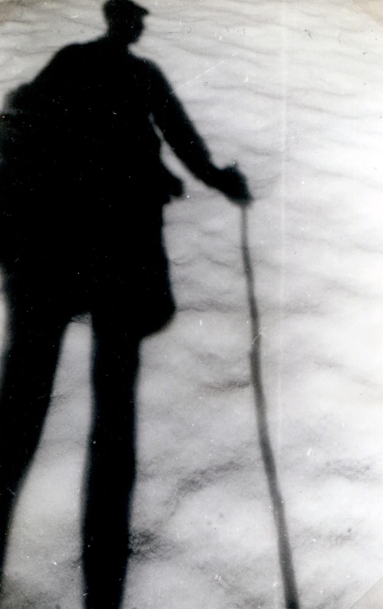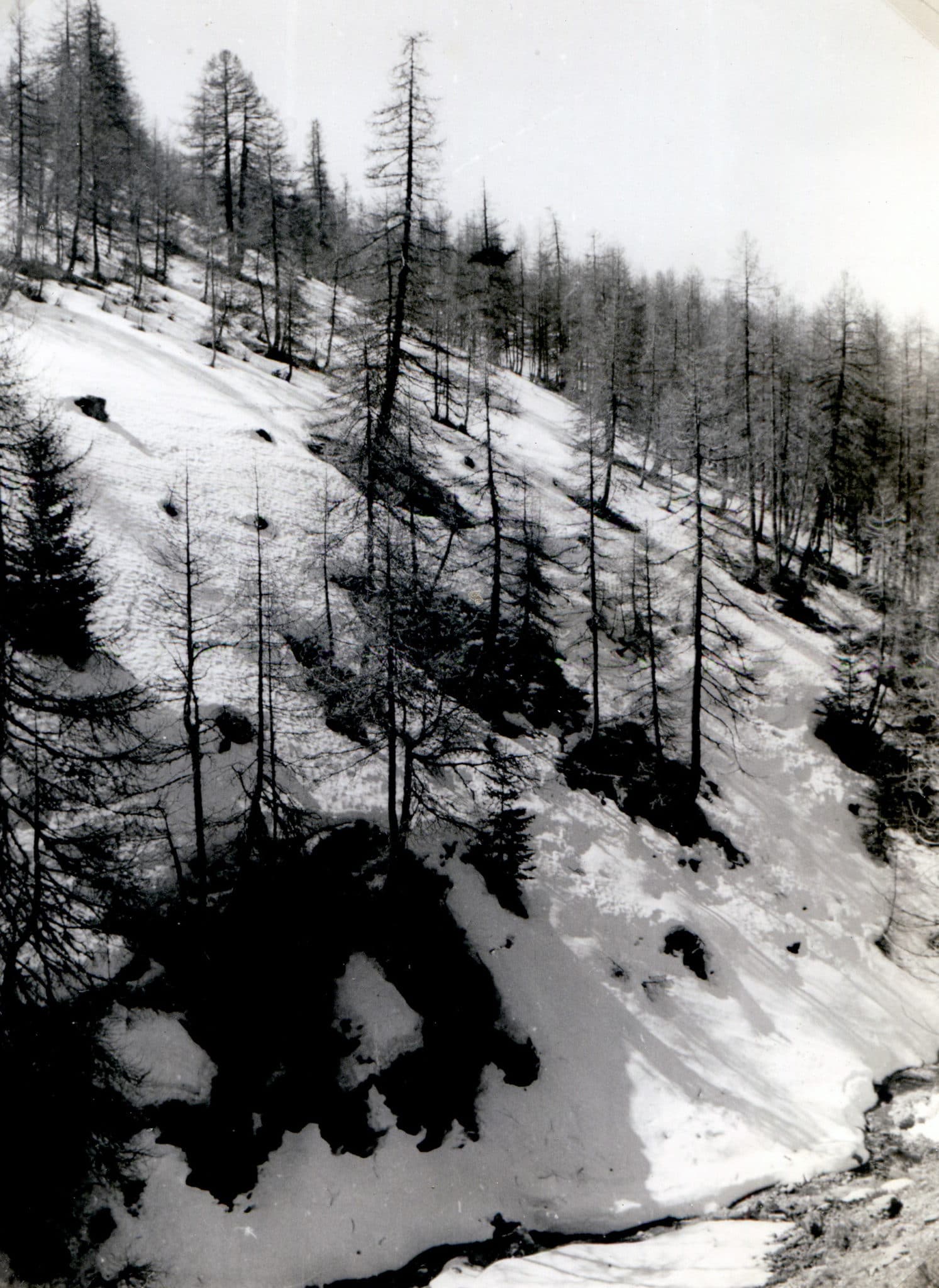 Parfois, à l’ombre, la neige porte encore. Ici, dans ce creux de vallon, un pont de neige enjambe un ruisselet qu’on entend chantonner. J’avance avec peu de confiance en sondant avec mon bâton : la neige me portera-t-elle ? Brusquement une vaste plaque de neige dont je suis le centre s’affaisse de quelques centimètres avec un bruissement étouffé. Impression angoissante : je passe en vitesse…