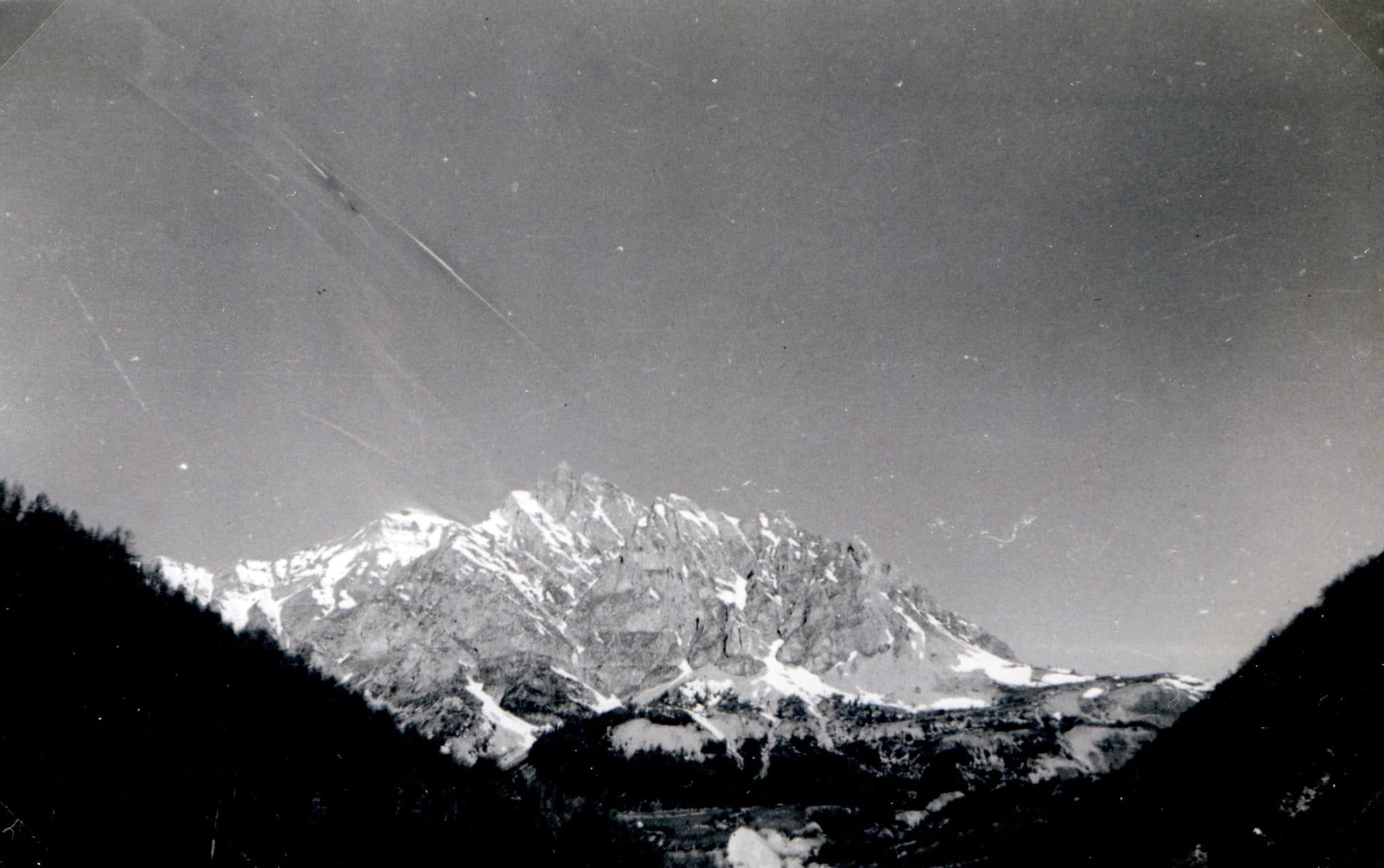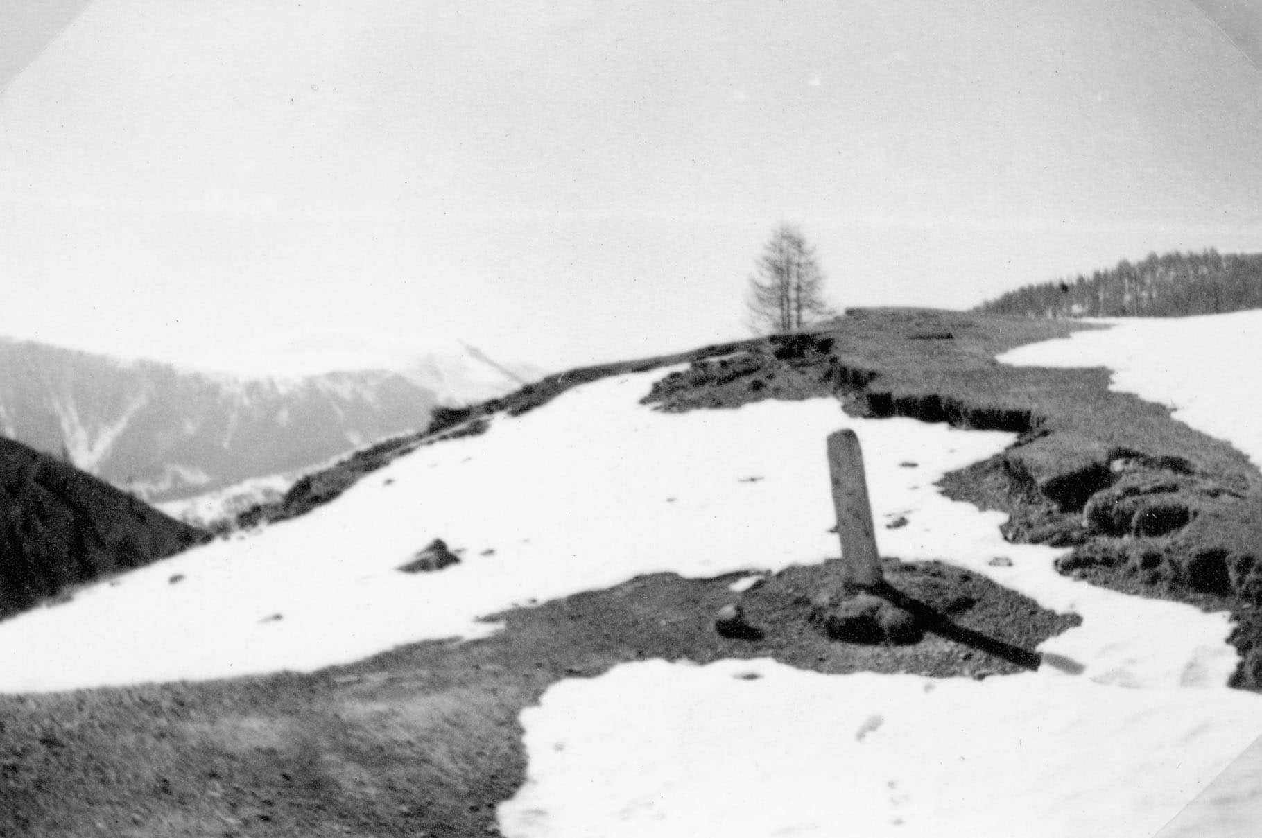 Par un sentier qui serpente parmi les buis, j’attaque le col. Montée sans histoires au milieu de panoramas qui s’élargissent sans cesse en aperçus nouveaux. Les derniers kilomètres se déroulent dans un paysage d’une aridité peu commune où quelques plaques de neige attardées soulignent l’altitude. Marqué d’un poteau rustique voici le col atteint et la descente sur la face nord se fait sur la neige. Mon alpenstock improvisé en noisetier est utile pour prévenir les dérapages sur la « tôlée ».