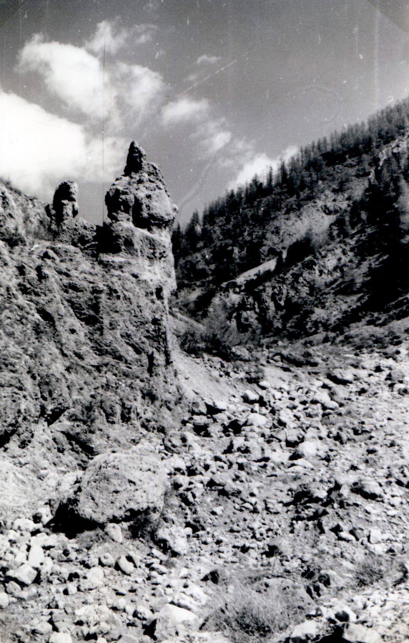 Voici la vallée du Cians presque à sec avec Beuil qui monte la garde sur un mamelon. Un torrent à sec bordés de rochers particulièrement déchiquetés me conduit au fond de la vallée. Quel dommage de ne pouvoir s’arrêter au bord du Cians pour le repas ! Je dois monter à Beuil avant midi pour me ravitailler : un sentier escalier, quand ce n’est pas échelle, m’épargne la route serpentine qui allonge son ruban de goudron jusqu’à la ville. C’est un important centre touristique et cela se sent aux multiples hôtels, restaurants et marchands de souvenirs. Plus difficiles d’y trouver des légumes frais, par exemple ! Un maraicher amblant achève de ranger ses marchandises dans son camion : « Trop tard pour avoir des tomates, Madame ? » « Non, combien en voulez-vous ? ». Ce kilo m’est compté 200 francs ! Les immondes Philistins… Peut-être pris de remords tardifs, ils me proposeront une place dans leur camion un peu plus tard sur la route. Je préfère la dignité de la marche à pied, évidemment.