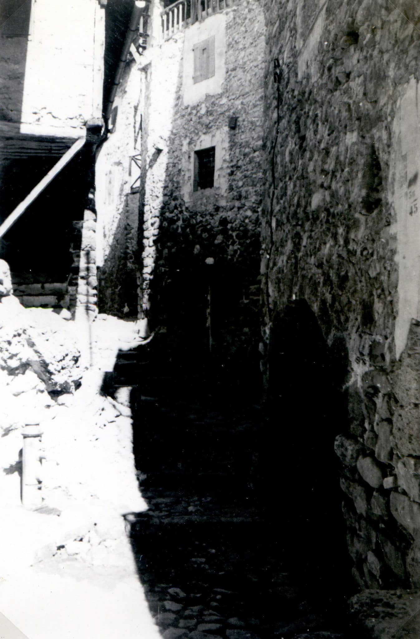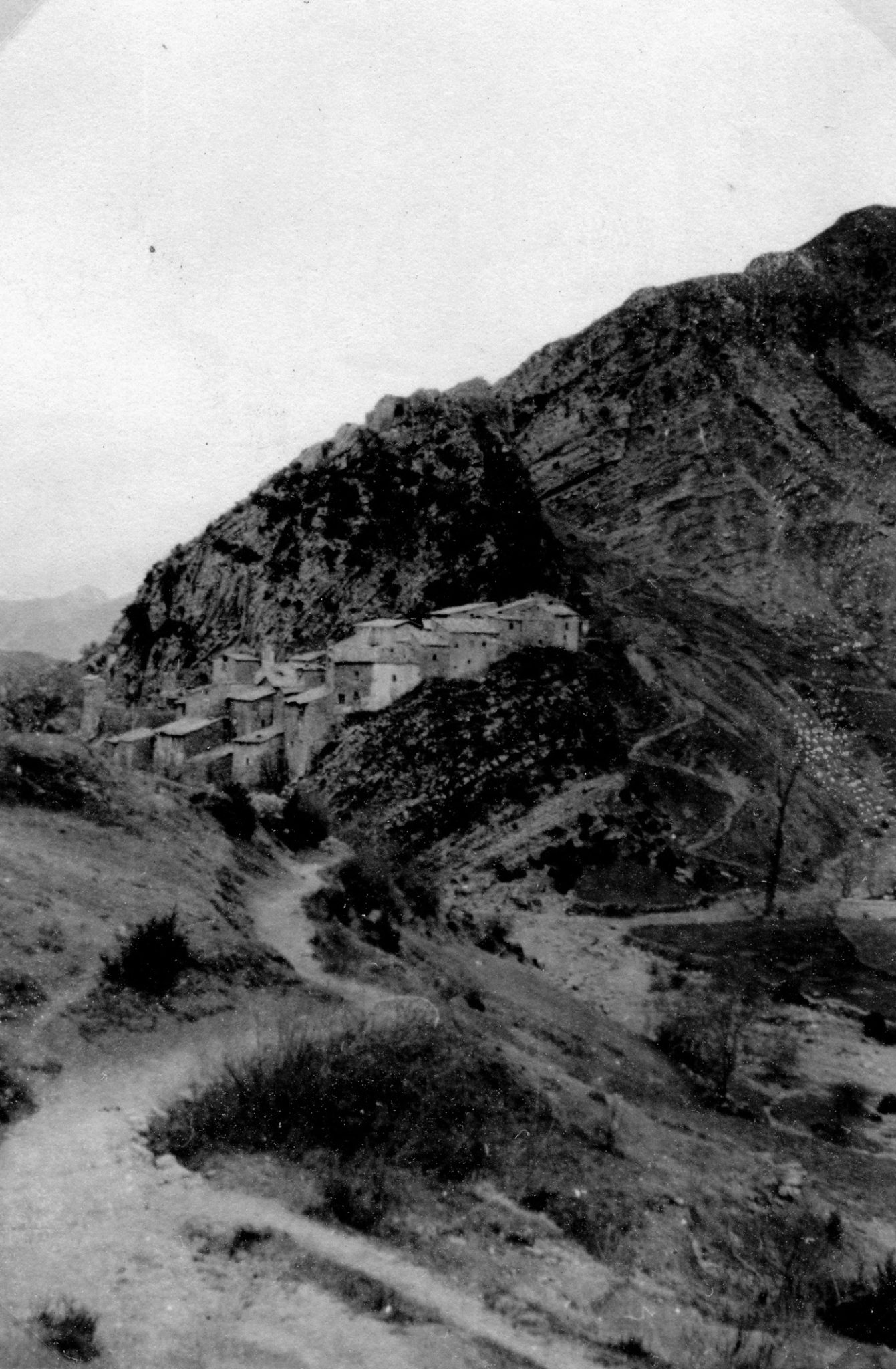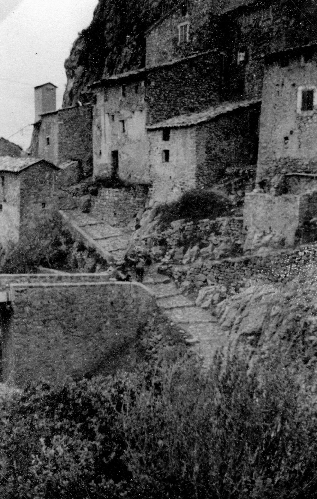 Un peu de neige au début puis marche facile dans d’amusants lacets qui découvrent sans cesse des points de vue nouveaux. Après la traversée à gué d’un filet d’eau qui a nom Aigue Blanche, voici Péone où j’achète quelques ravitaillements et muse un peu dans les vieilles rues pittoresques.