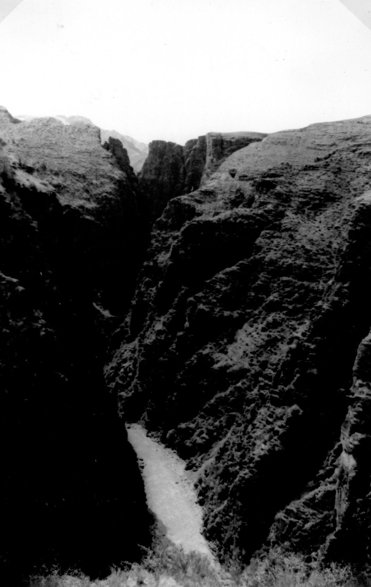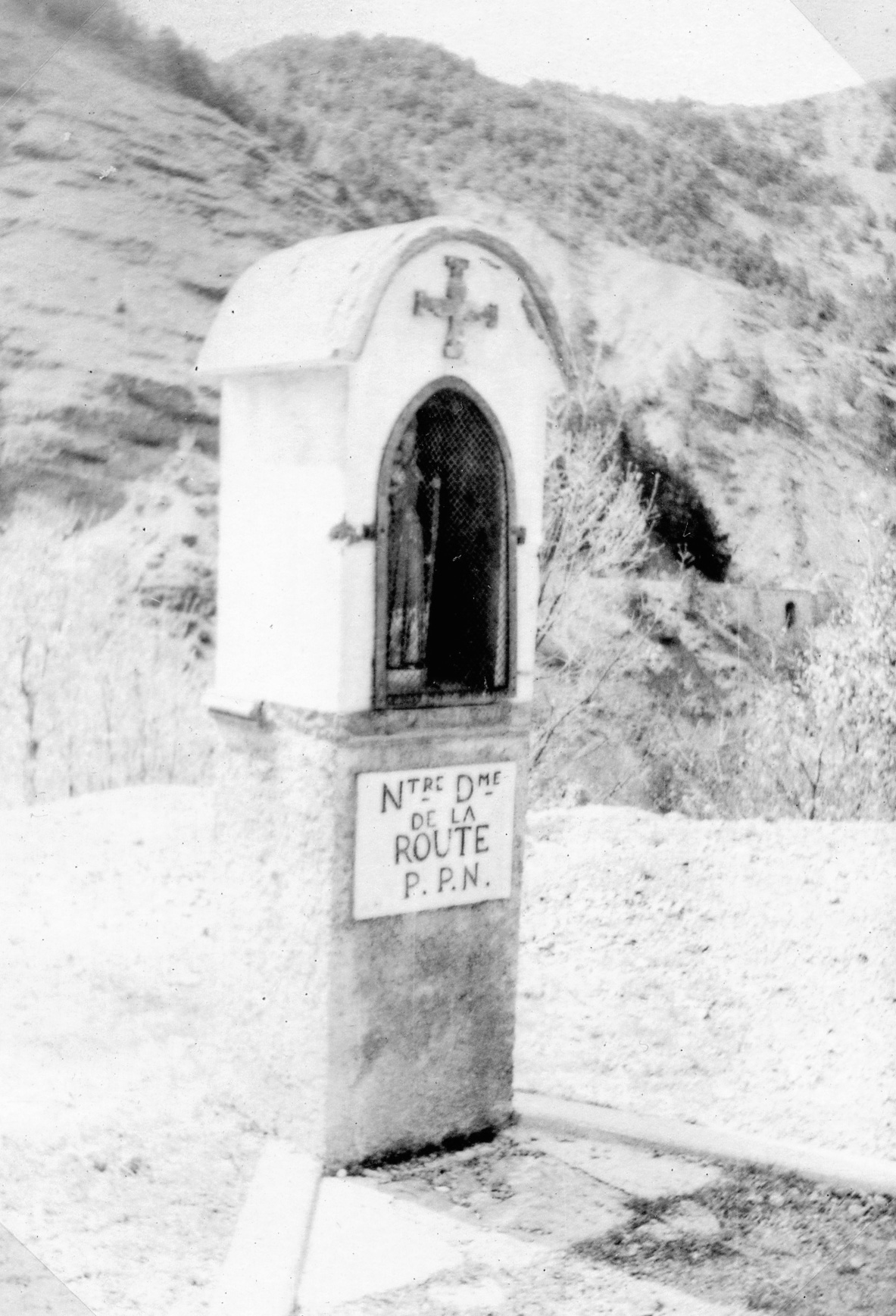 Après un court trajet au long du Var (mignonne chapelle à gauche) la route se laisse distancer par le fleuve qui s’enfonce dans les fameuses gorges de Daluis. La goudronnée est large et mathieux au possible avec ses sens giratoires aux endroits les plus dangereux, mais pourtant quelles vues ! Le Var serpente minuscule aux fonds d’à-pics de 2 à 300 mètres de haut taillés dans un schiste rouge carminé piqué çà et là d’arbustes rachitiques. Sauf le fleuve, atteignable nulle part sauf un ou deux sentiers de chèvres, sur plus de 10 km. de route je ne vois pas une goutte d’eau. Seules, sur l’autre versant, quelques cascades hors de portée.