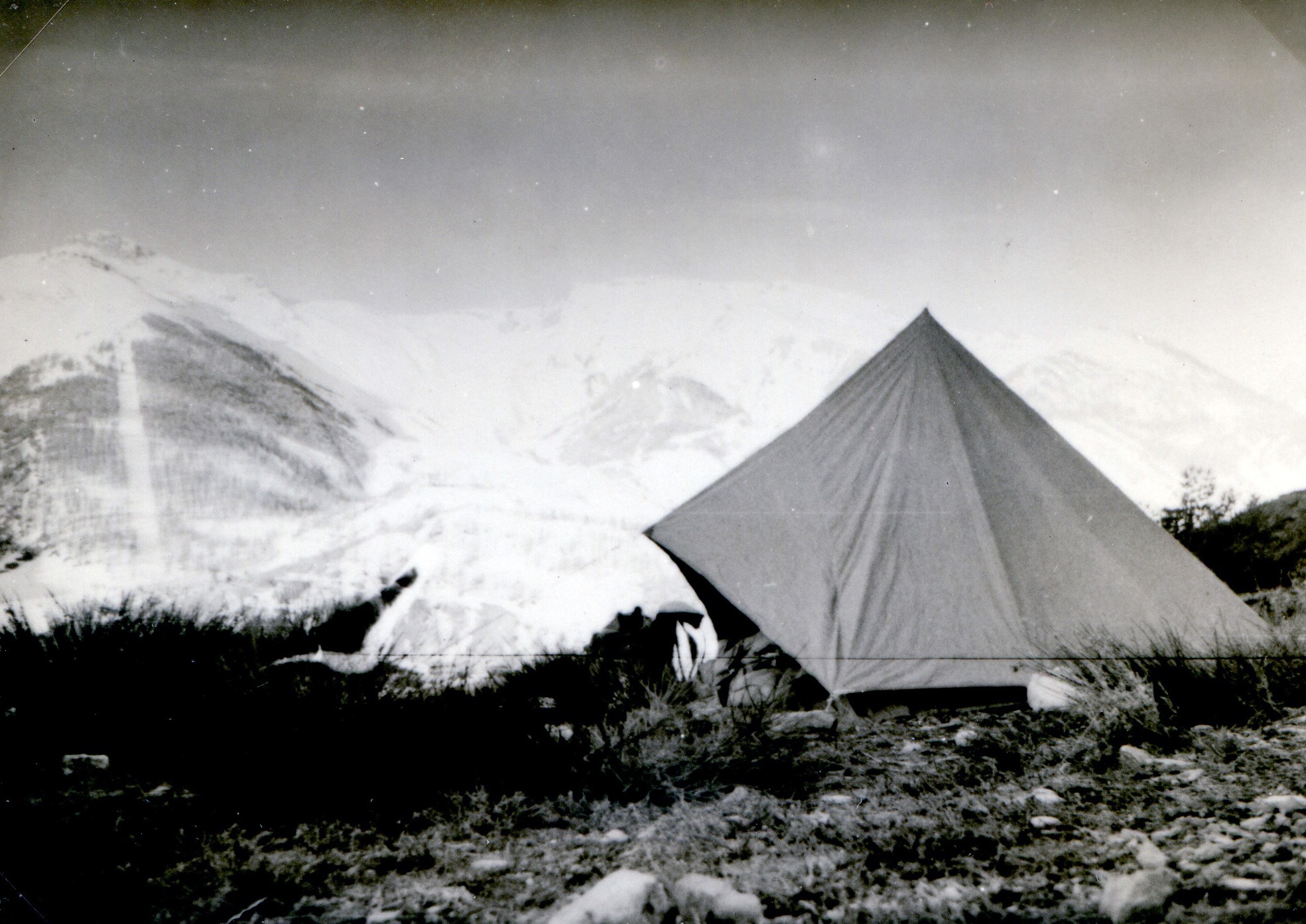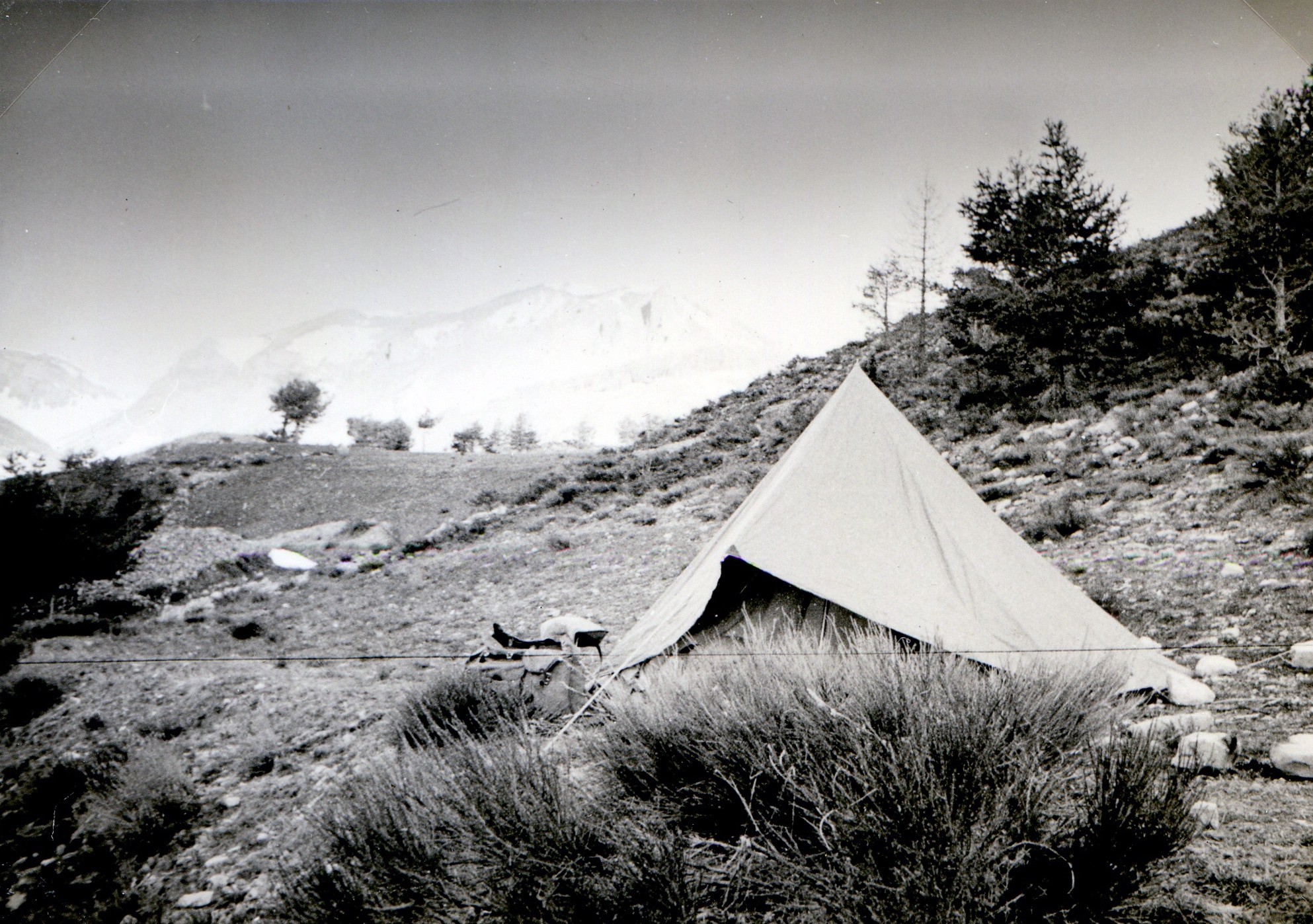 Quelles joie et gloire de voir l’itisa montée sur plus d’un mètre de neige au-dessus de 2 000 ! Voici un camp assez patagon malgré la montée en télé, courte concession au mathieuïsme, d’ailleurs rachetée par la progression dans la neige. Je pense avoir mis environ trois heures pour franchir les 4 km de distance et quelques 300 m de dénivelé qui me séparent du plateau de Las Donnas. Trois heures d’efforts pas pour rire. Des images classiques de la littérature-ski sont dans ma tête : il glissait aérien, léger comme une mouette, équilibre de rêve, loi de la pesanteur vaincues, ivresse de la vitesse, griserie de la glissade… Ce n’est pas exactement ce qui caractérisait mon allure de vieille tortue rhumatisante.