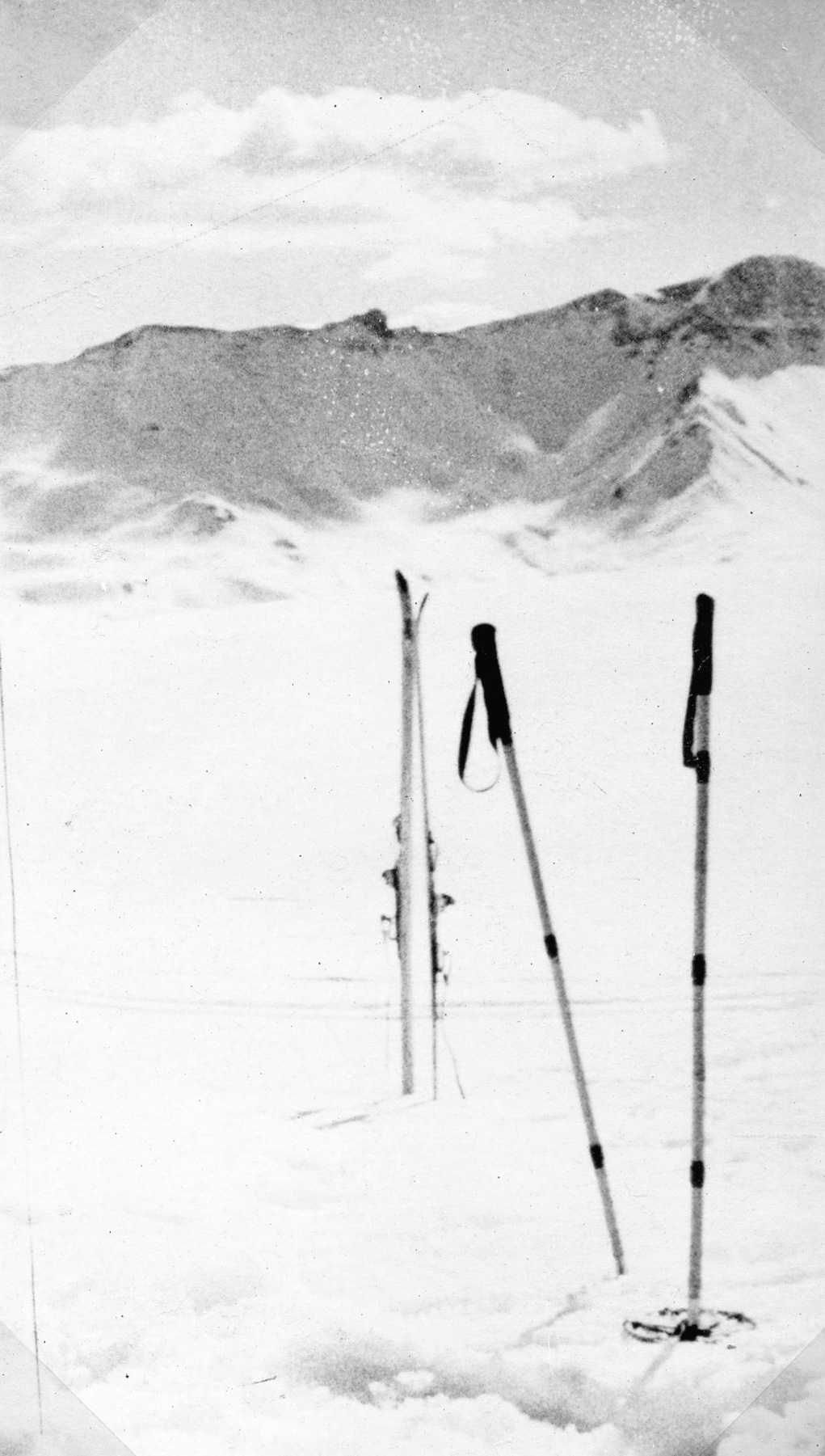 Ici, plus de rochers et une pente trop raide pour moi. A ski, je fais deux mètres et je tombe. Héroïque ou inconscient je déchausse et continue en enfonçant dans la neige bien souvent jusqu’au ventre. Après plus d’une heure d’efforts, je suis complètement liquéfié et à peine à mi-chemin. Sous peine de tomber faible il faut manger. Je pique mes skis, je pique mes bâtons et, assurant mon sac sur eux, je m’installe en plein soleil pour casser la croûte. Quel soulagement de troquer les lunettes de glacier toute embuées pour d’honnêtes lunettes de soleil normales ! La réverbération est aveuglante et malgré toute ma bonne volonté il m’est impossible de regarder le paysage à l’œil nu plus de deux ou trois mètres. Quelle catastrophe si l’on perdait ou cassait ses verres dans de telles conditions !