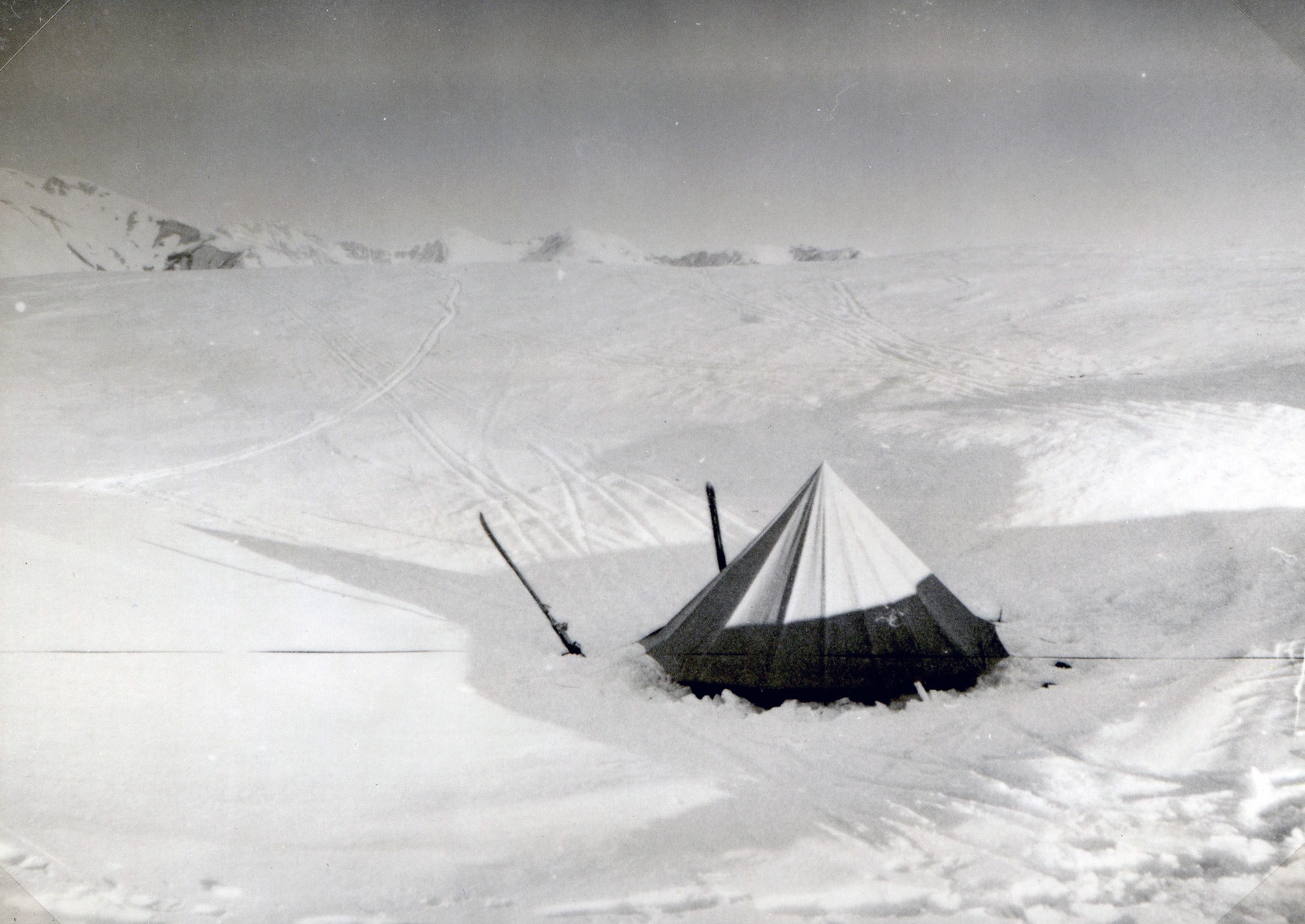 Mais le soleil baisse, la neige gèle : il me faut monter ma tente. Je piétine avec conscience la surface nécessaire et dans la neige pilée qui gêle vite les piquets paraissent tenir ferme. Je les renforce pourtant par mes skis, mes bâtons et des pierres trouvées dans l’abri.